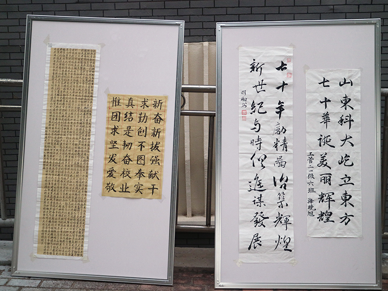 下午四时,林荫道已有不少同学等候,书画作品排列在林荫道的两侧,在同学们的注视下,书画社的成员一手执毛笔,缓缓写出“天道酬勤,厚德载物”,大气磅礴而不失优雅,书画社负责人孙怡同学说道:“我会将自己对学校70年华诞的祝福化作诗文,用书画艺术的形式展现出来,为我校70周年庆典增添色彩。”