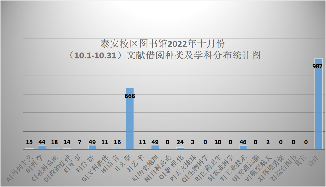 泰安校区图书馆2022年十月份(10.1-10.31)文献借阅种类及学科分布统计图