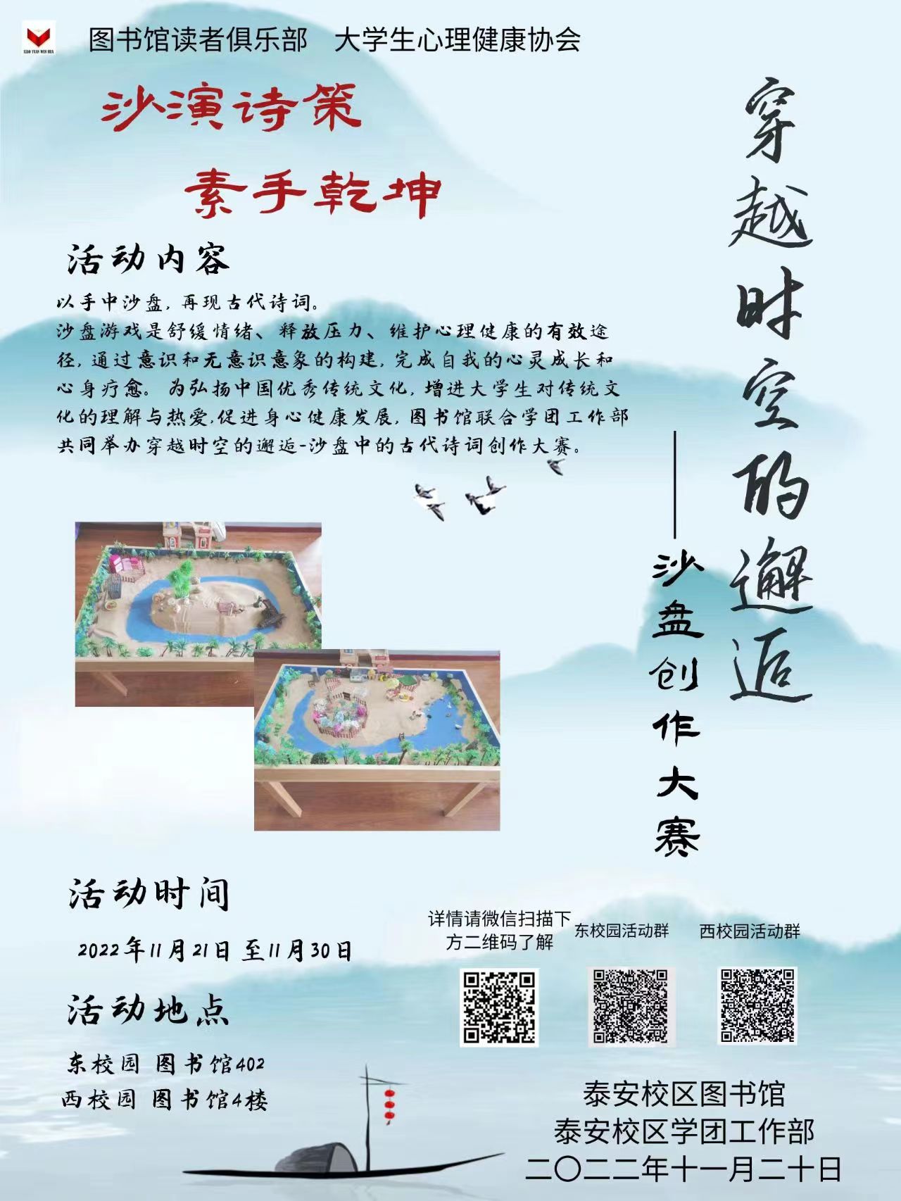 为弘扬中国优秀传统文化、推动诗词、诗歌的阅读与传播,推动大学生对传统文化的理解与热爱,促进审美能力与创造与创新能力的发展,同时促进大学生身心的愉悦,图书馆联合学团工作部共同举办穿越时空的邂逅——沙盘创作大赛。