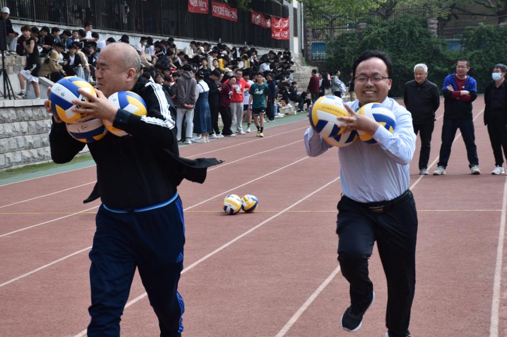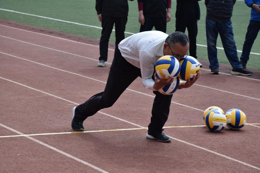 在30m抱球跑比赛现场,随着发令枪响起,运动员们抱着三个排球从起点冲了出去,大家你追我赶、奋勇争先,展现了体育比赛努力拼搏、永不言败的竞技精神。
