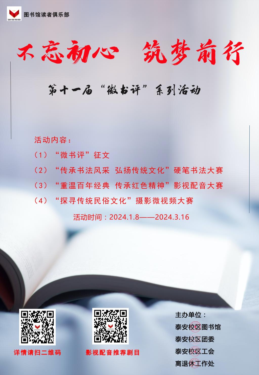 为推动校园阅读活动的深入开展,提高校区师生“好读书、读好书”的热情,校区图书馆联合团委、工会与离退休工作处共同举办“微书评”系列活动,活动包括微书评征文、硬笔书法、影视配音、微视频创作等,现面向校区全体师生及离退休教职工发布活动通知。