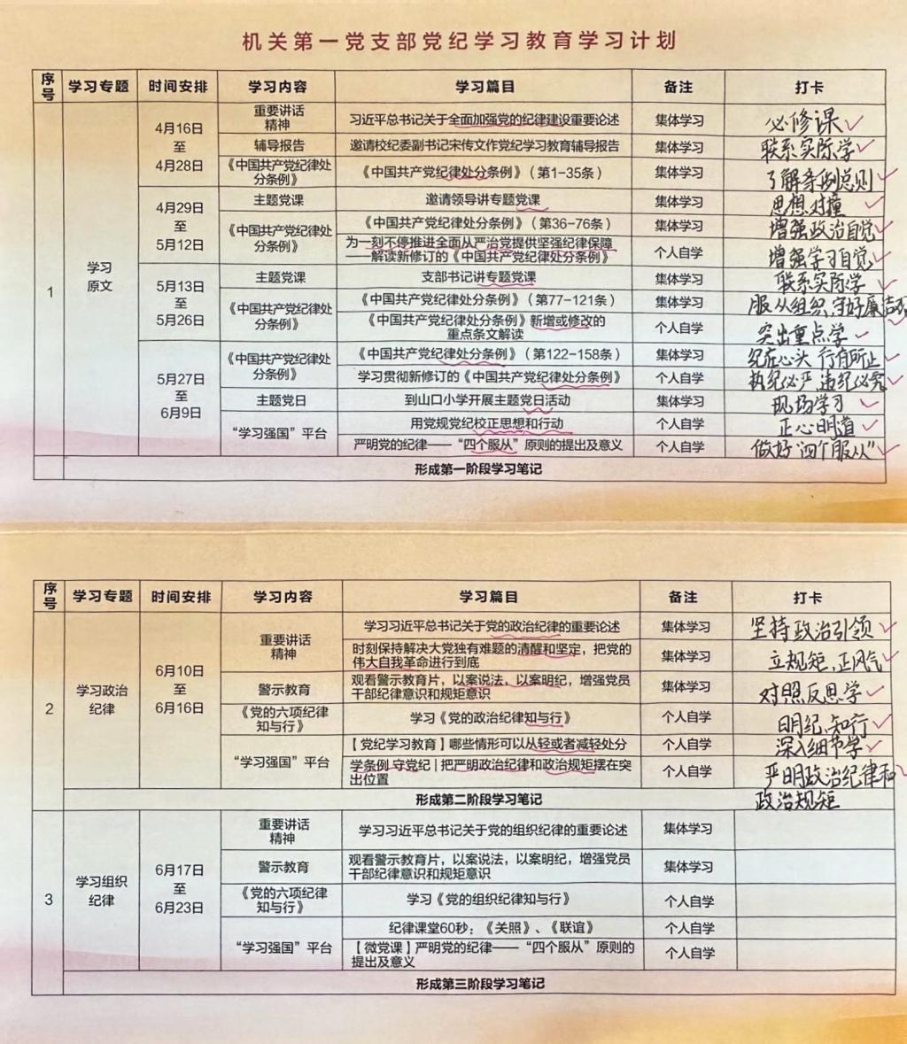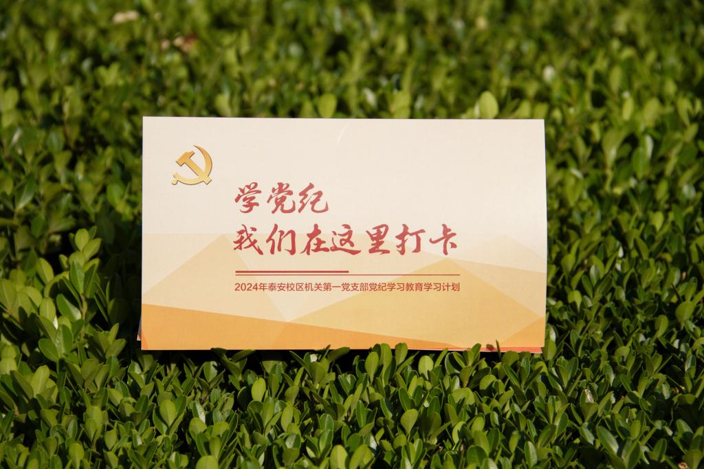 在3044永利集团官网泰安校区机关第一党支部的每位党员同志的案头,都摆放着一份橘红色折页。每完成一项学习,大家便在折页的相应位置认真做上标记。这是机关第一党支部为推进党纪学习教育走深走实专门设计制作的党纪学习教育折页,在党纪学习教育开展之初就送到了每位党员的手上。