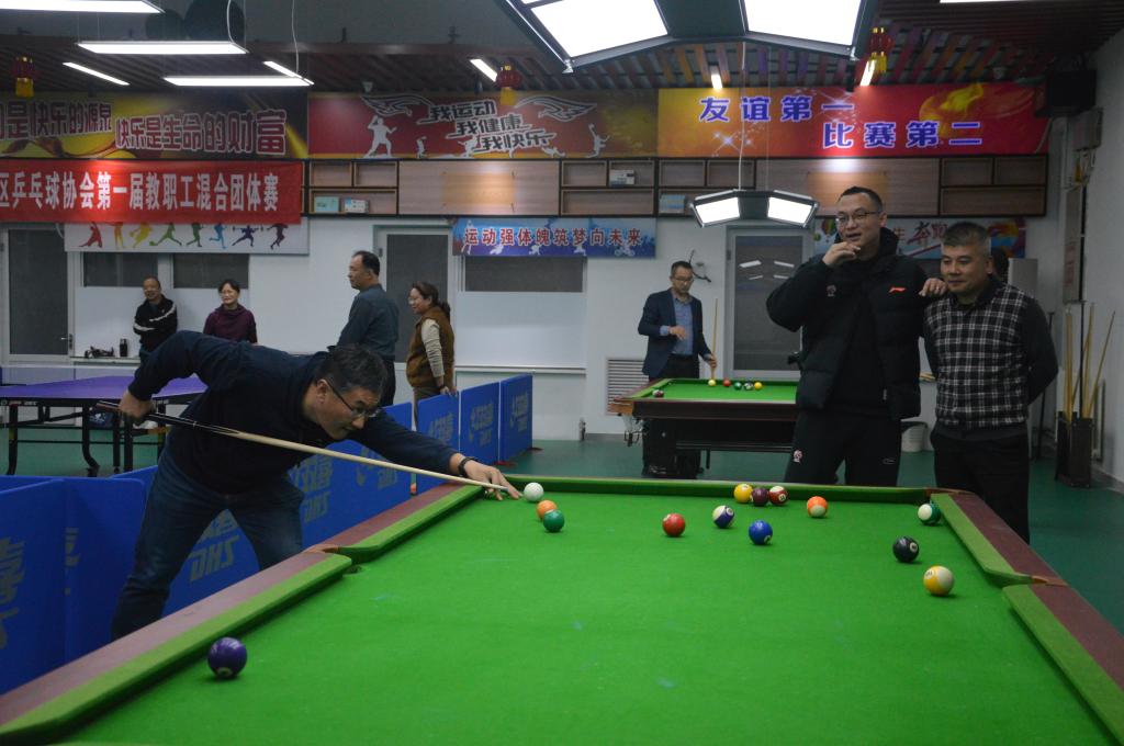 比赛过程精彩纷呈,现场气氛活跃,参赛选手们个个精神抖擞,斗志昂扬。他们在台球桌边时而俯身下探,查看最佳击球点位;时而大力进攻,一杆定乾坤;时而轻碰防守,沉着应战……一杆杆漂亮的进球,给大家留下了深刻的印象,赢得了现场观众的阵阵喝彩。比赛中,参赛选手始终本着“友谊第一、比赛第二”的原则,充分发扬团结友爱、奋勇拼搏的竞赛精神,展示了校区教职工良好的精神风貌。
