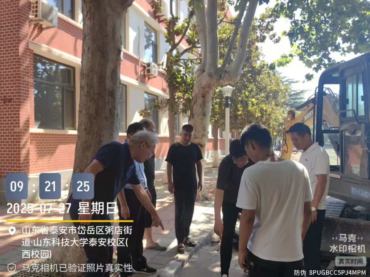 逄杰文一行首先查看了校园建筑物楼顶防水和校园门口值班室维修改造施工情况,提出在雨季来临之前,尽快完成防水工程,同时提醒施工人员,动火作业要完备动火审批手续,做好防火措施,防止火灾事故发生,施工区域做好围护,防止坠物伤人。随后重点查看了西校园成才大道道路整修项目,对施工提出了整改建议和要求。一是施工中大型机械作业要注意安全,做好各项防护措施,禁止无关人员进入作业现场,防止发生事故;二是对道路排水沟进行清淤、加固,科学做好排水口的雨箅子,提高排水效率,对积水严重的路面调整路面排水坡度,利用自然排水和路面排水系统相结合的方式,彻底解决路面积水问题;三是做好成才大道西段两道路面排水横沟的修复,特别是要做好西门附近道路转弯处排水横沟的恢复,最大限度减少西门口大门雨季排水压力和值班室积水问题,以方便师生雨季出行。